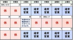 令和7年12月30日(火)午後~令和8年1月5日(月)まで年末年始休業とさせていただきます。